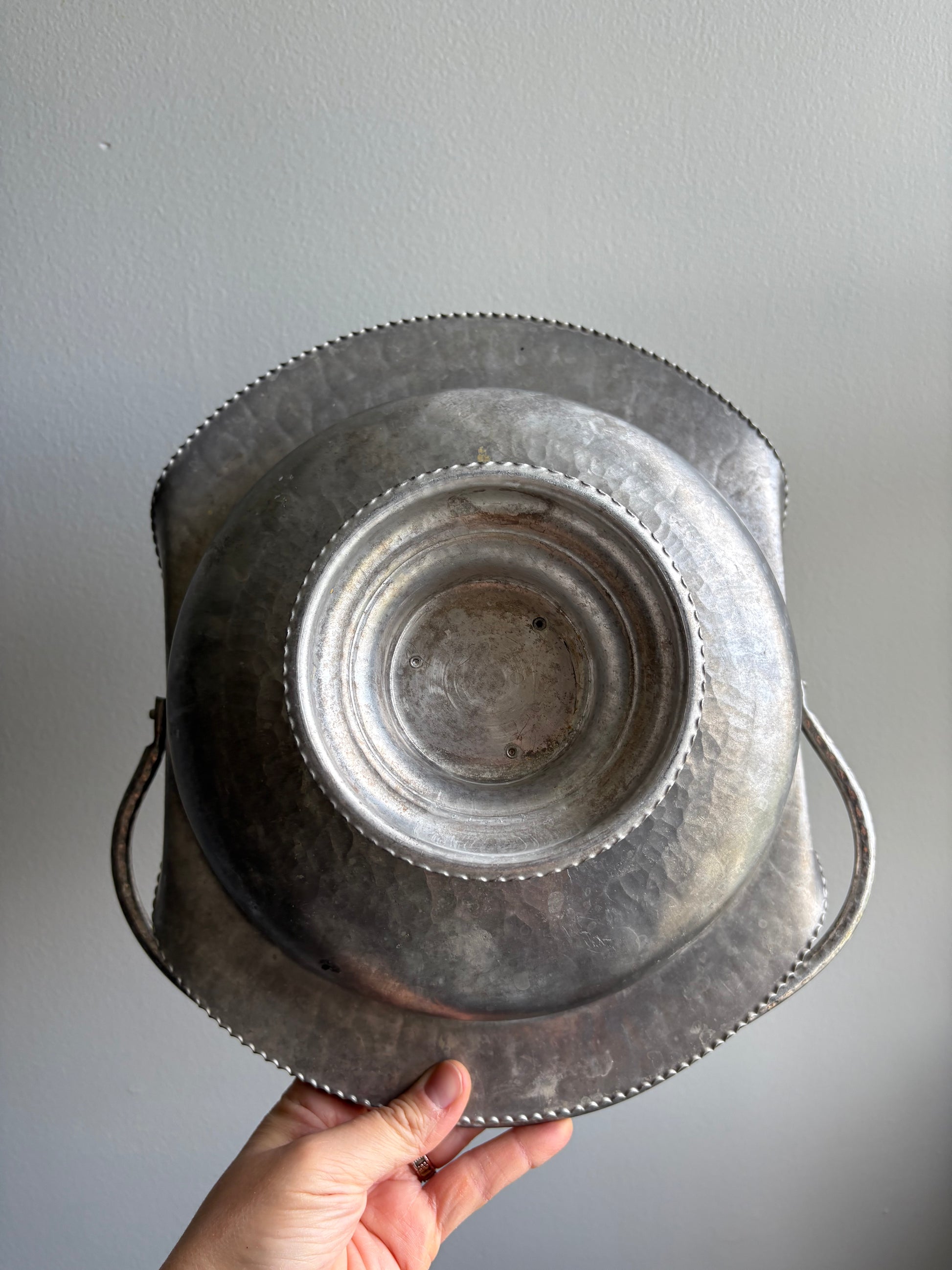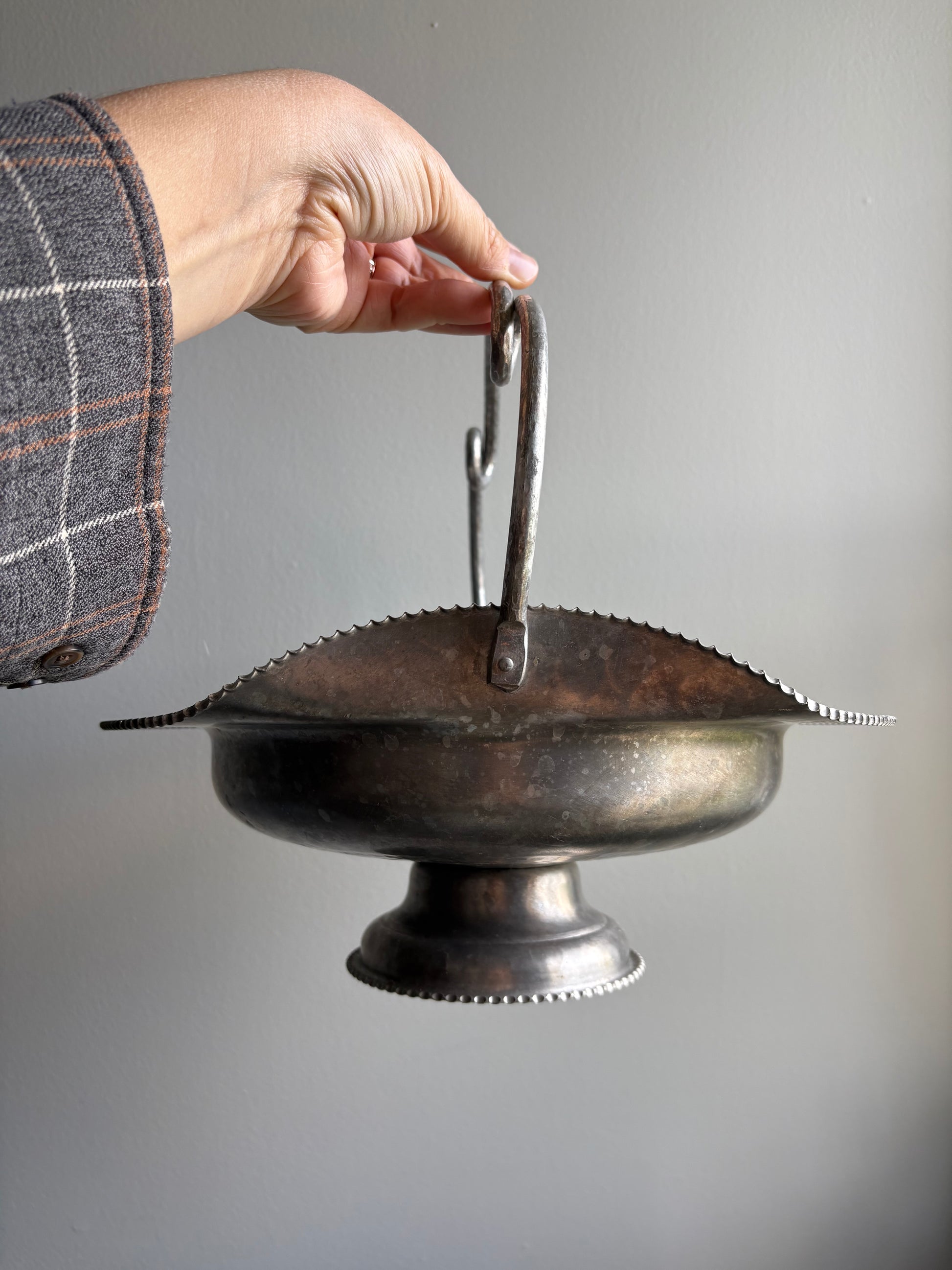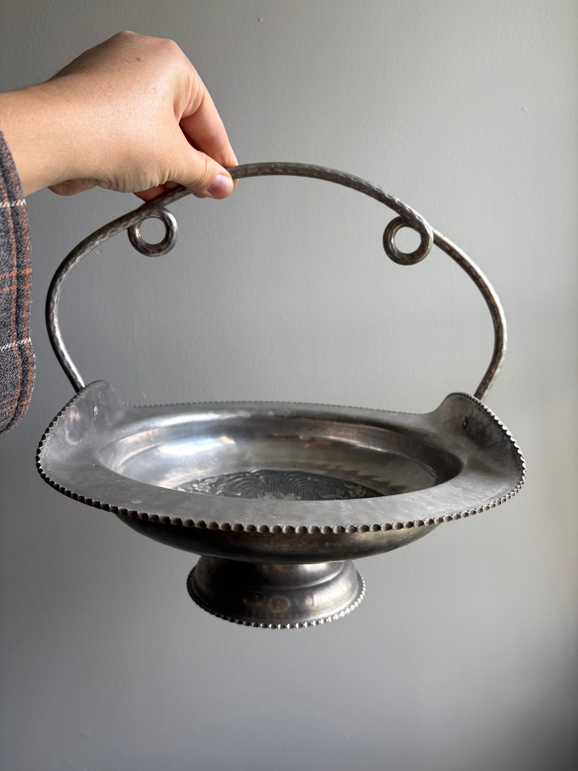 Hand Wrought Metal Pedestal Basket with Bird and Floral Design