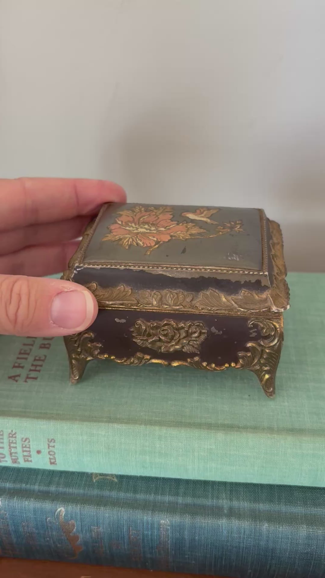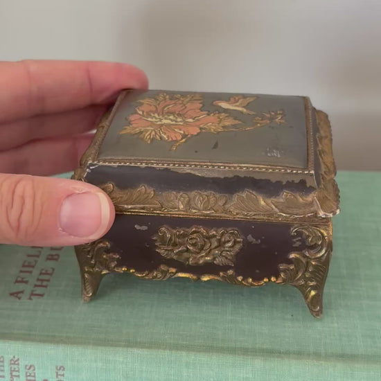 This tiny music box is decorated with a deep brown lacquer finish and ornate gold-tone metalwork. It plays “Chariots of Fire” (a bit slowly) and has initials engraved inside the lid.