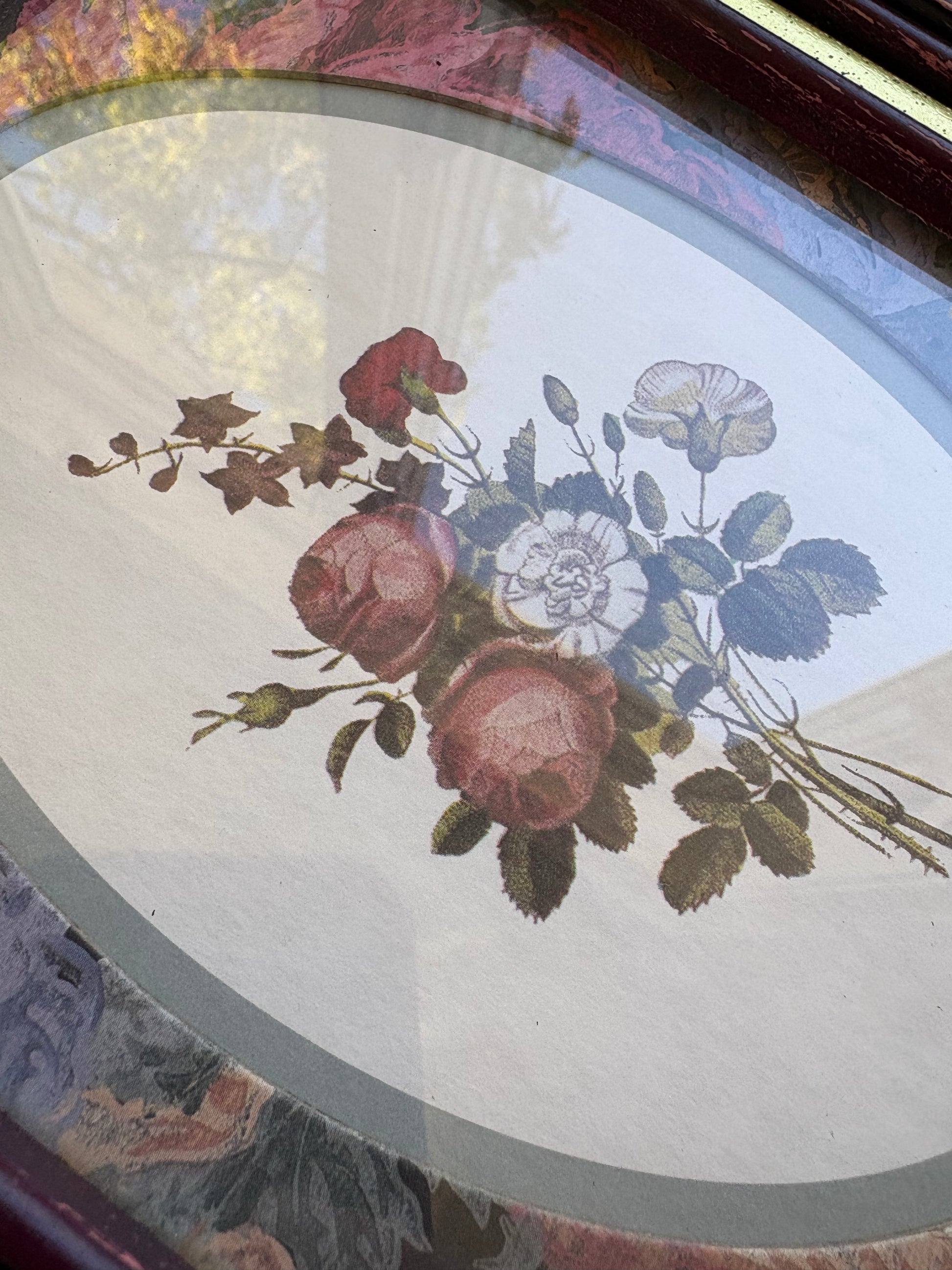 Oval floral prints with floral matte in maroon, gold, and black frame. Both have some wear to the frame.