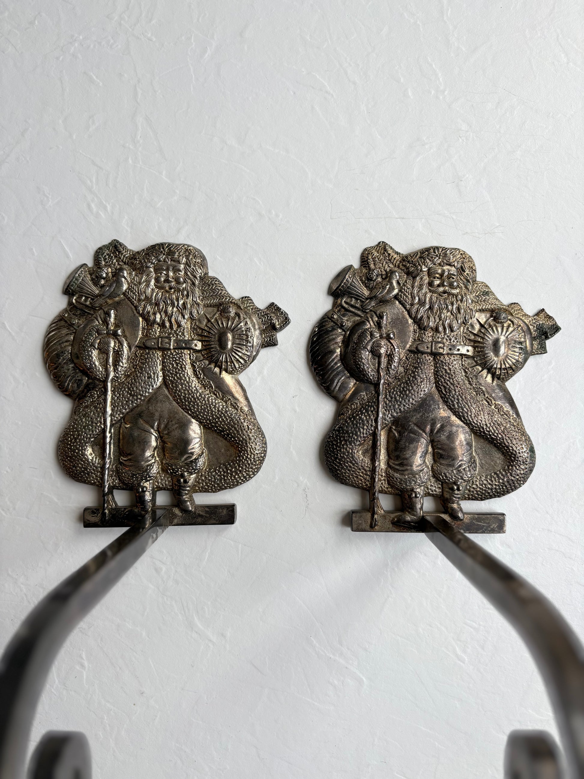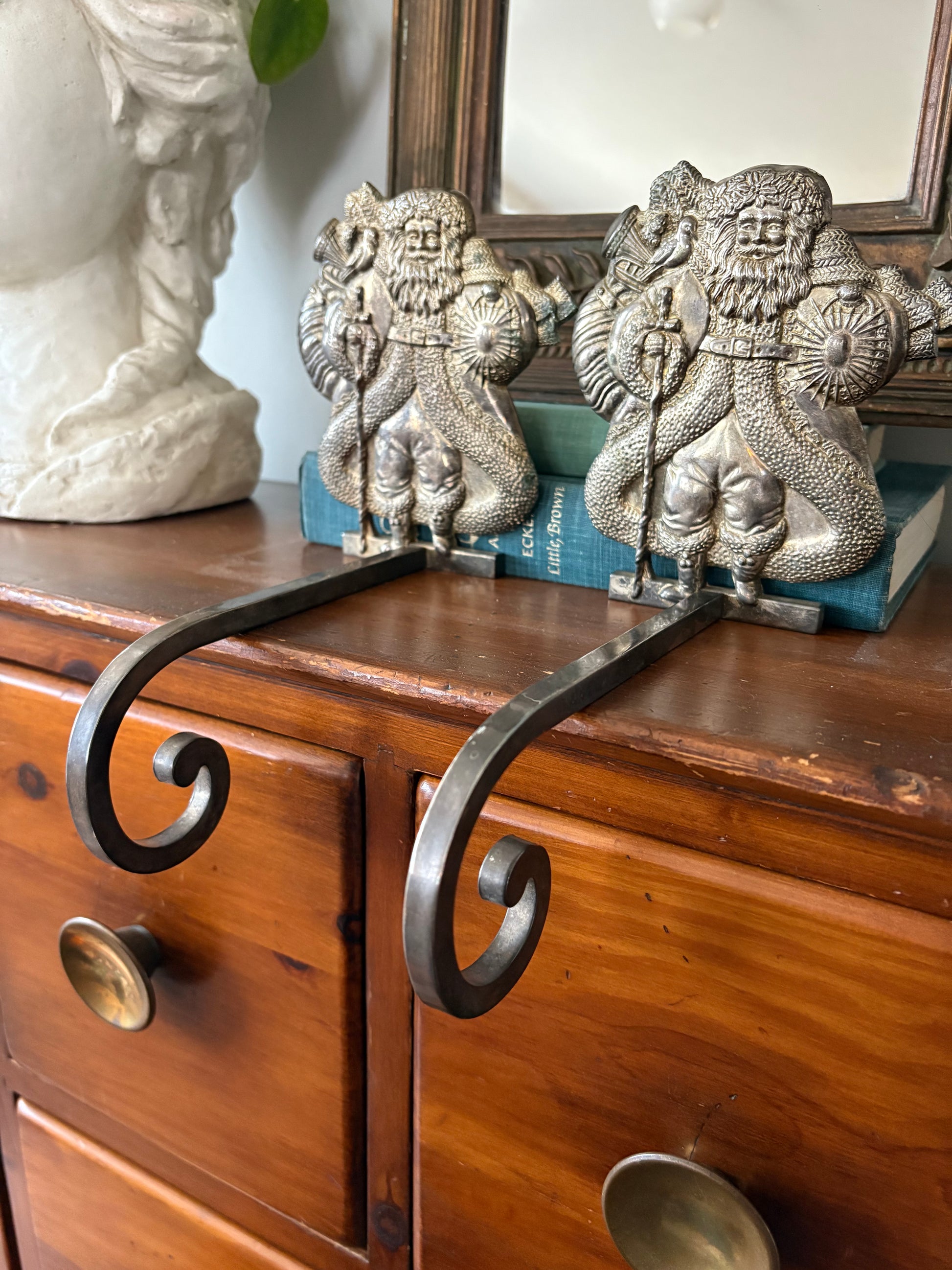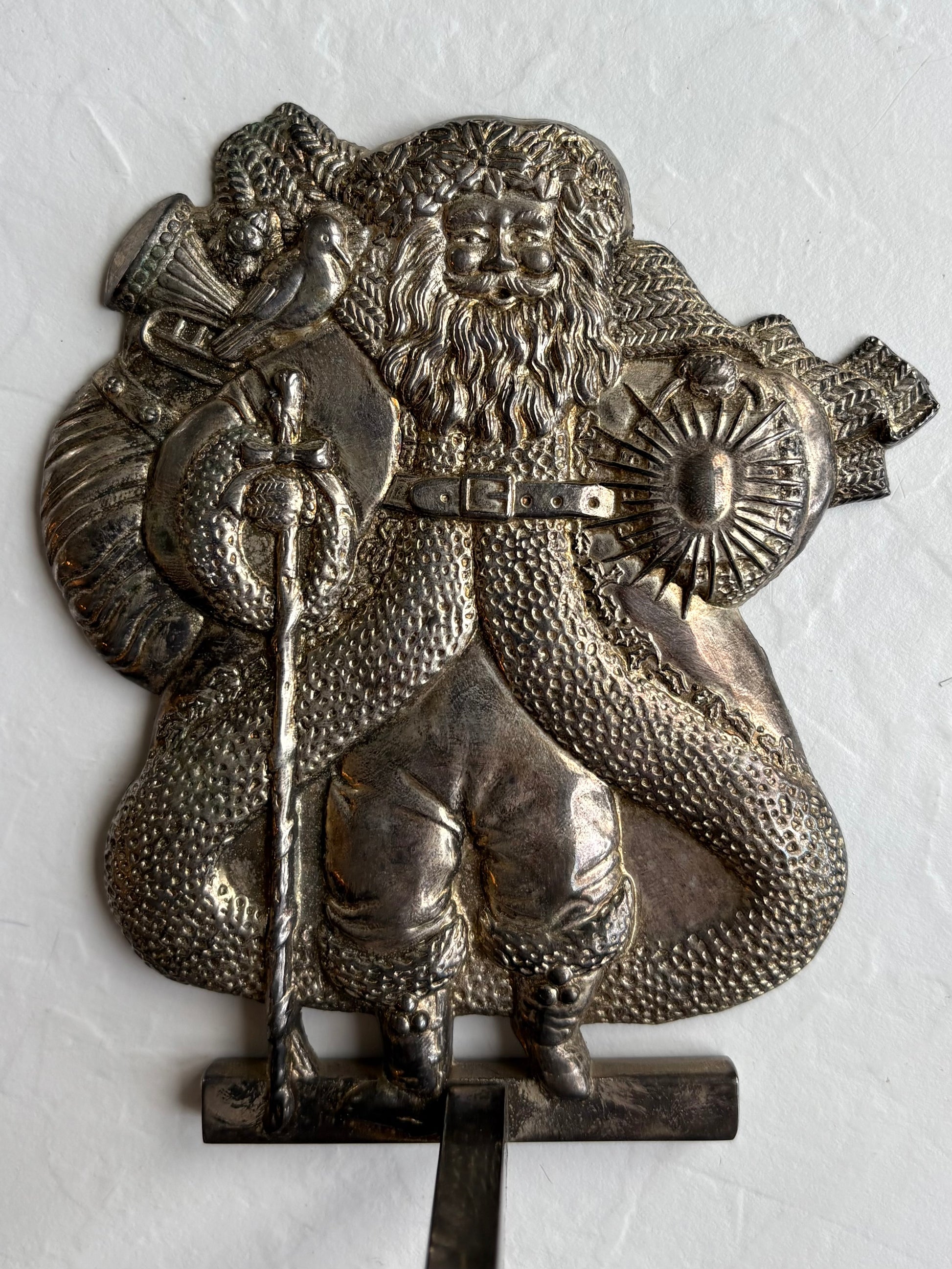 Made from a heavy, sturdy metal in a silver finish, these Santa stocking holders are classic and elegant. Both have some patina. Listing is for one.