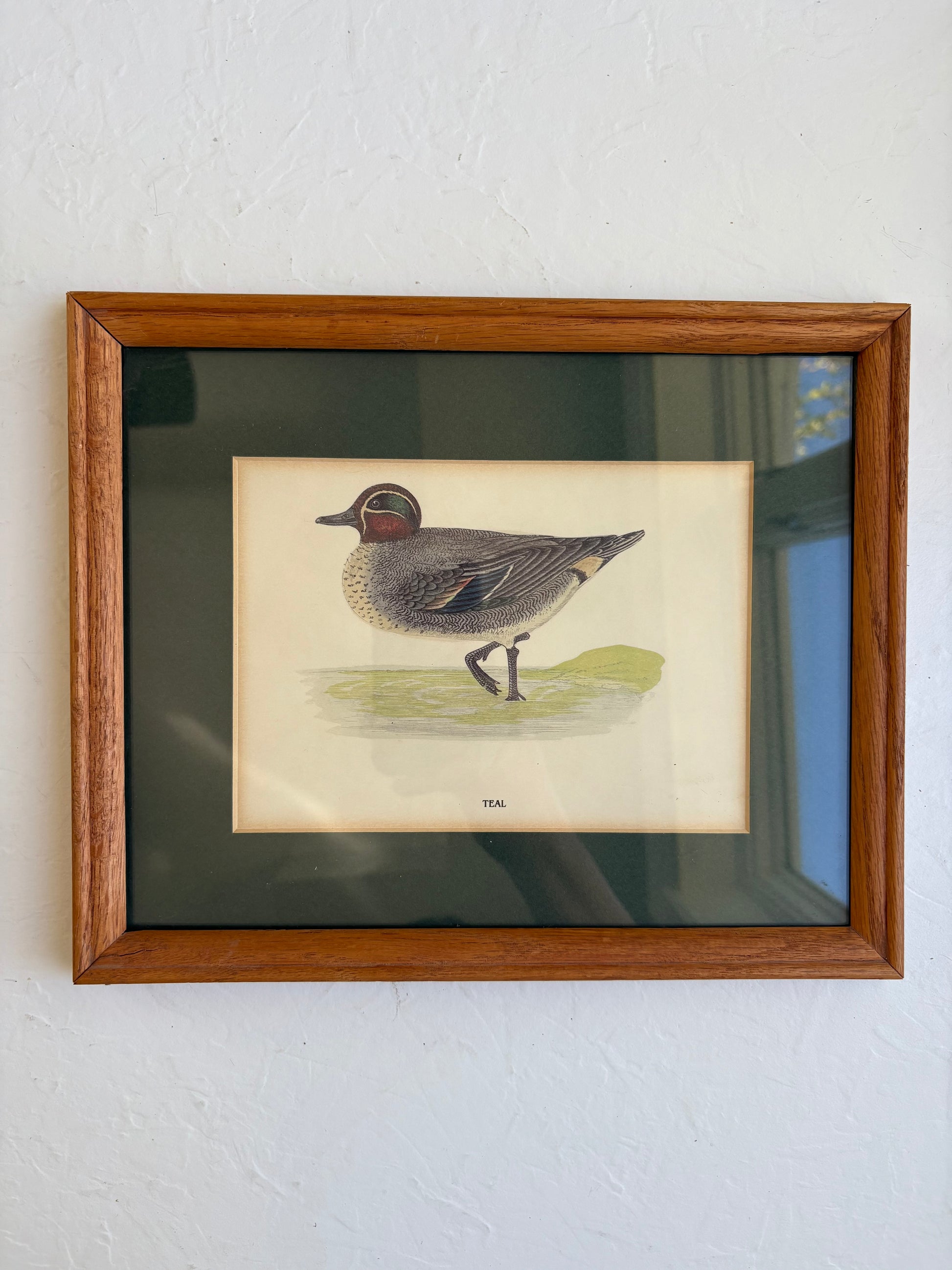 Teal duck print in wooden frame and behind glass.