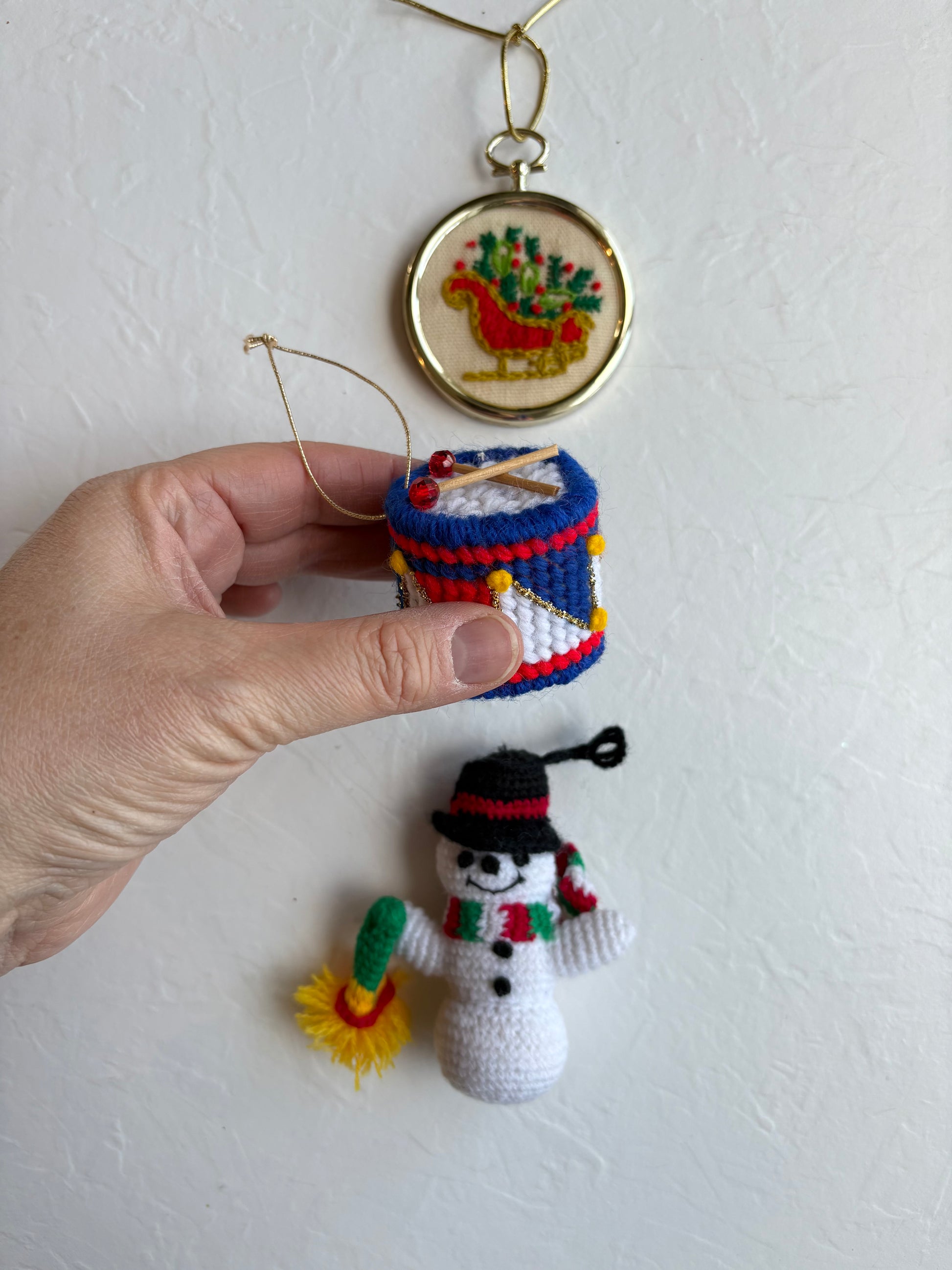Adorable needlepoint sleigh, needlecraft drum, and crochet snowman—all one-of-a-kind and handmade. Listing is for all three.