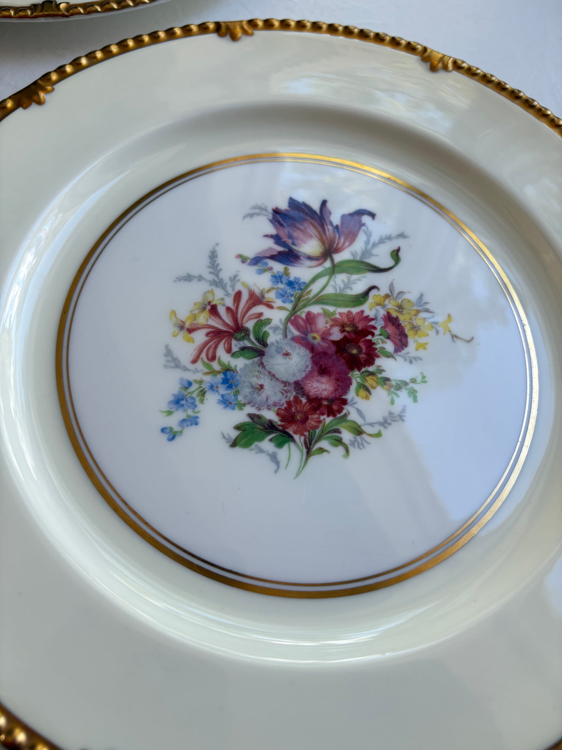 Beautiful fine bone china dinner plates. Some minor wear to gold rim. 10.75” diameter