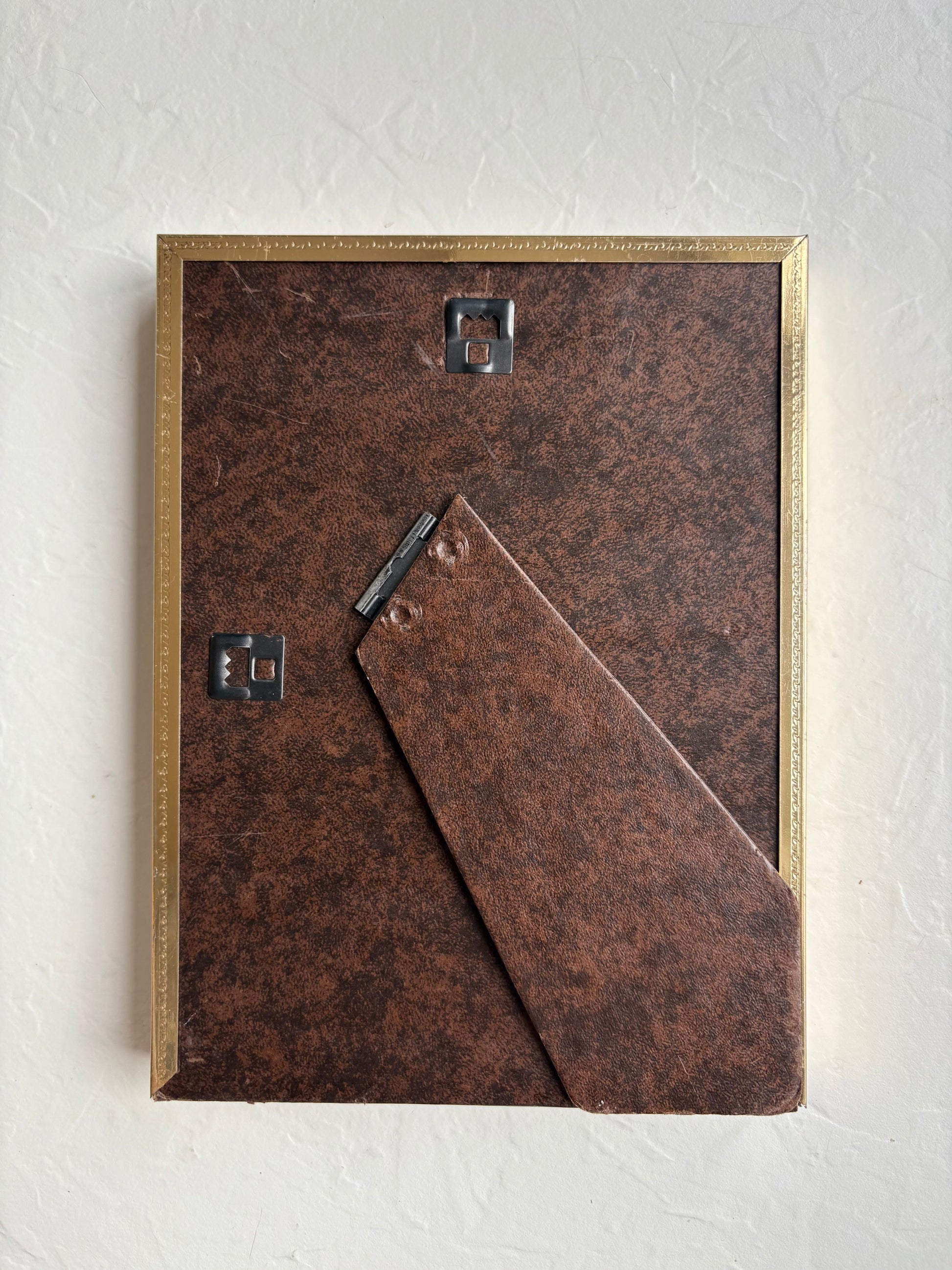 Oval gold-tone matte in brass frame. Has stand and hook on back. Some scratches on frame.